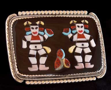 Regular price $750.00 USDSale price $750.00 USD Regular priceUnit price perSale Sold outSilver with Jet background, Mother of Pearl Clowns,Turquoise, & Coral accents 3 1/4 x 2 1/4" This Turquoise jewelry belt buckle is for a 1 1/2" wide...