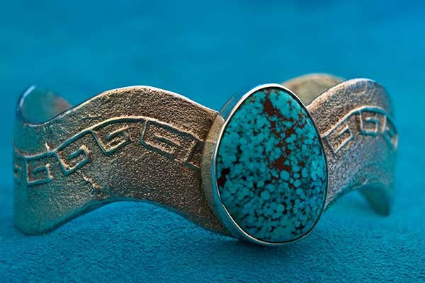 Regular price $1,650.00 USDSale price $1,650.00 USD Regular priceUnit price perSale Sold outHere is a John Shopteese - Tufa Cast Silver and Gem Bird's Eye Morenci Turquoise Bracelet Kokopelli are carved throughout the design. Featured is...