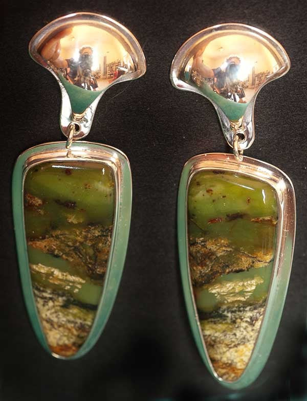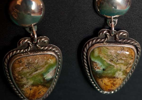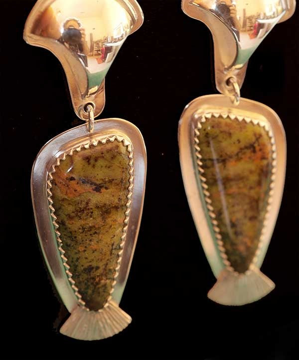 Regular price $225.00 USDSale price $225.00 USD Regular priceUnit price perSale Sold outThis rare Serpentine was mined near Morenci, Arizona These Ray Scott Arizona Native American Serpentine Silver Earrings are 2 1/2" long