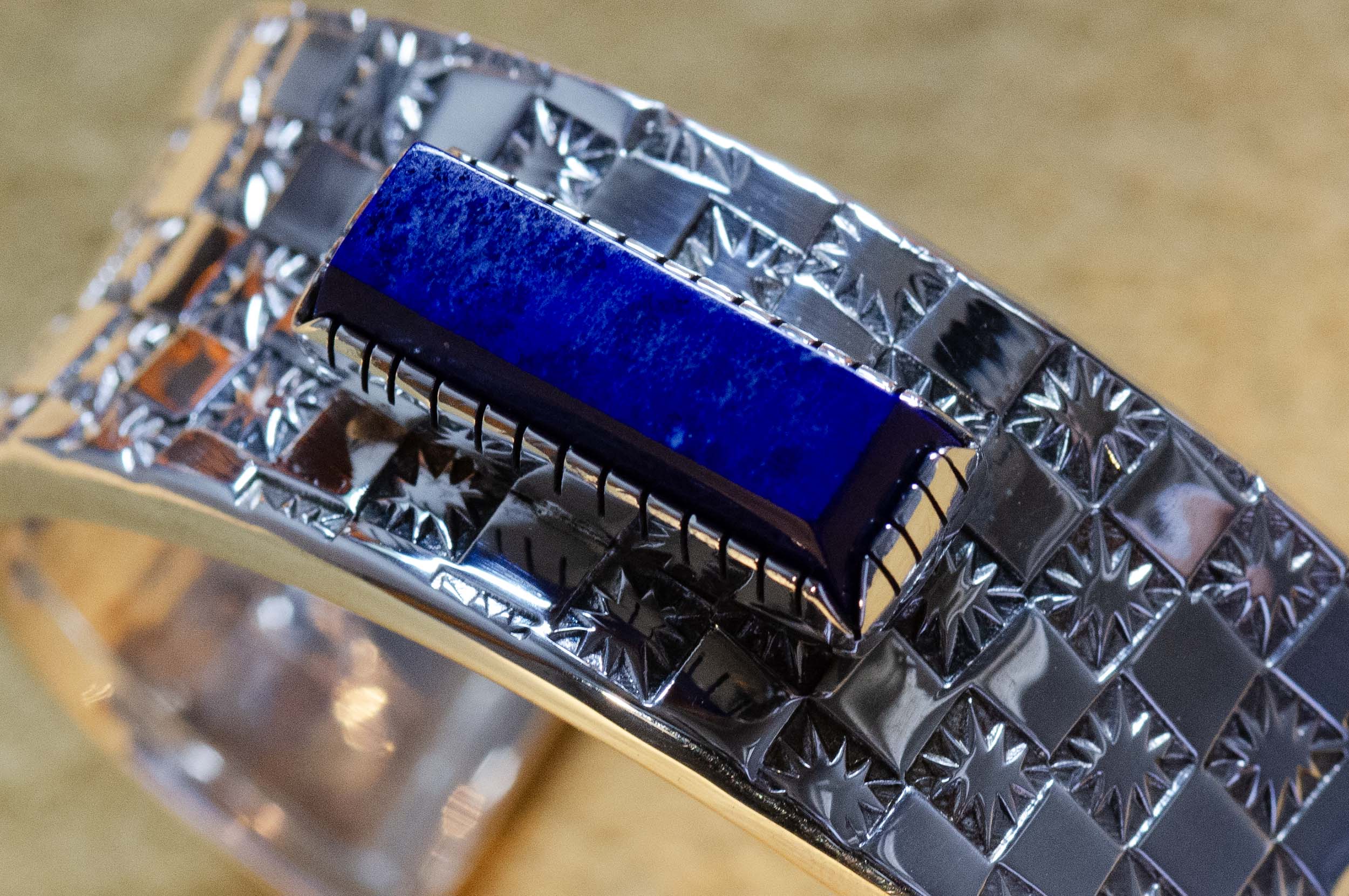 Sam LaFontain, Large Lapis Gem in a Handmade Silver Star Pattern Bracelet