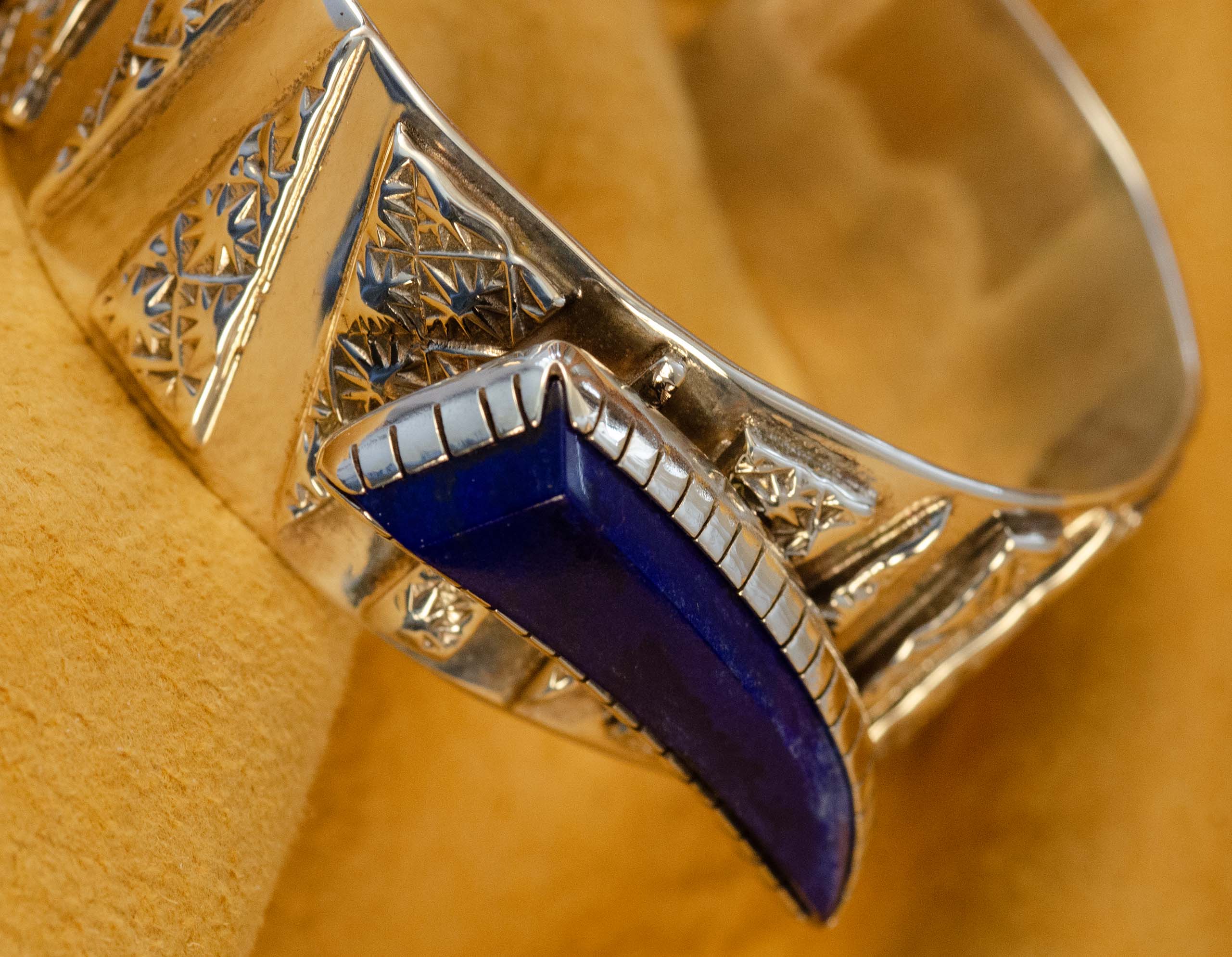 Regular price $2,750.00 USDSale price $2,750.00 USD Regular priceUnit price perSale Sold outSam LaFontain, Hand made repeating Star Pattern Bracelet with a rare Lapis Gemstone. Both the silver work and lapidary is by Sam LaFontain.The repeating, raised stars...