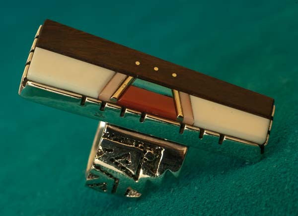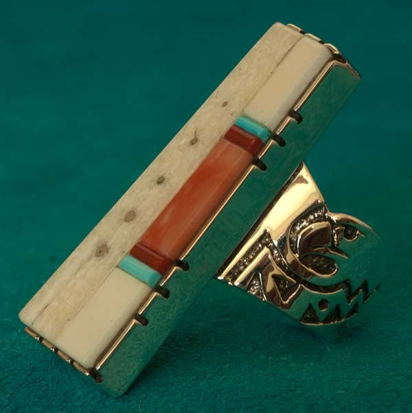 Regular price $675.00 USDSale price $675.00 USD Regular priceUnit price perSale Sold outSilver Inlaid with 14K Gold, Turquoise, coral, and fossil ivory This Native American Jewelry inlaid Ring is size 8 1/4
