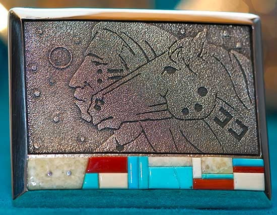 Regular price $1,950.00 USDSale price $1,950.00 USD Regular priceUnit price perSale Sold outRichard Tsosie Silver Horse Belt Buckle, Silver Overlay with Granulation Multiple layers of silver were used to create this handmade Masterpiece. Each layer holds a different part...