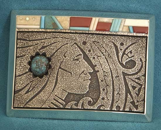 Regular price $1,950.00 USDSale price $1,950.00 USD Regular priceUnit price perSale Sold outRichard Tsosie Eagle Chief Belt Buckle Silver Overlay Brave, Eagle, and Flag with silver Granulation The natural, High Grade Gemstones featured are Fossil Ivory, Red Mountain...