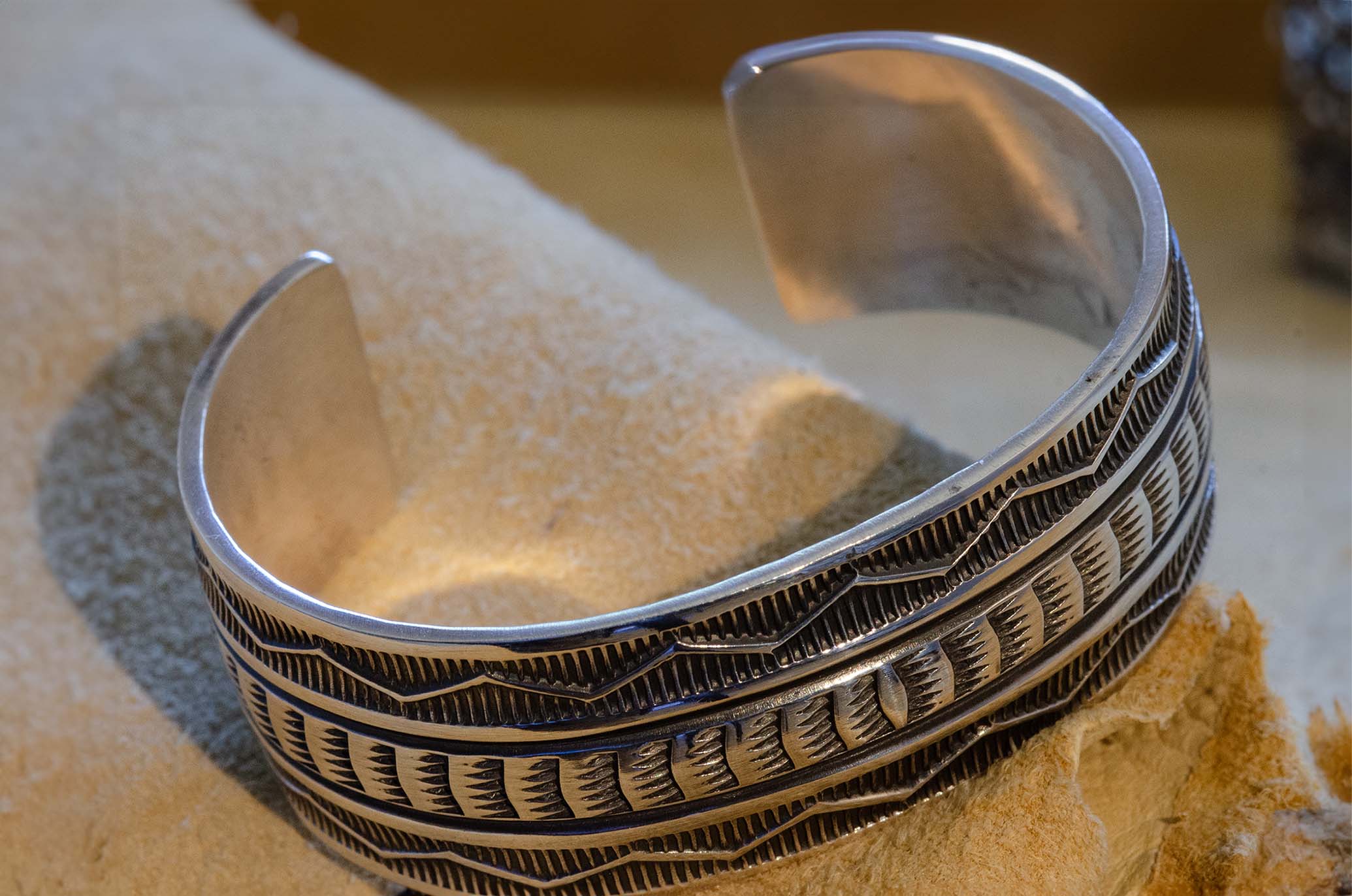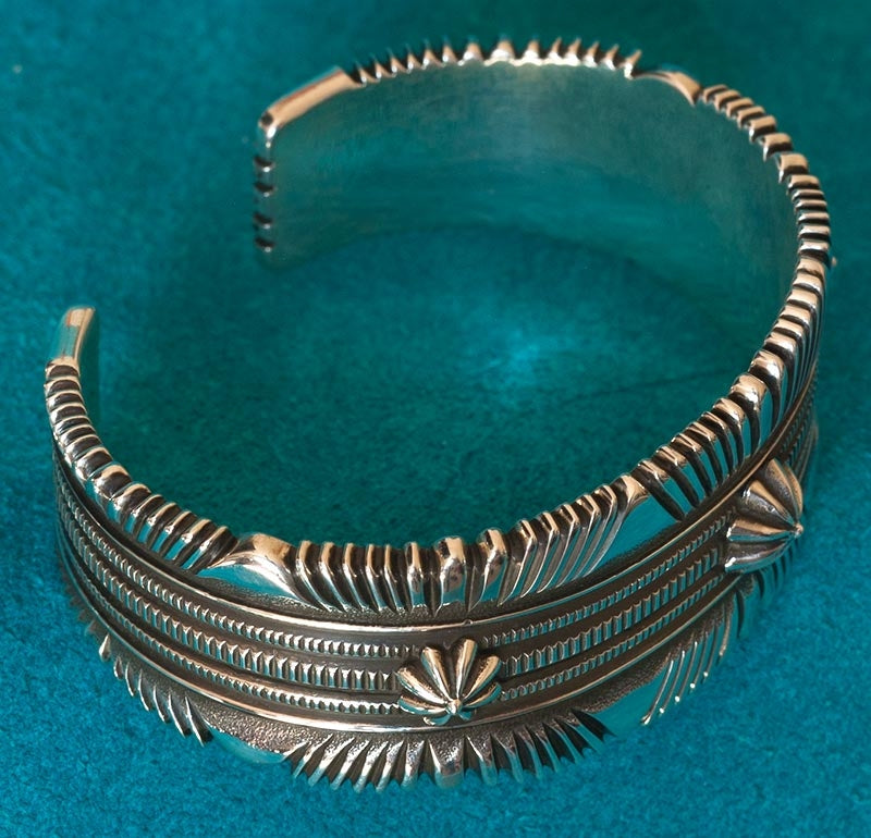 Regular price $450.00 USDSale price $450.00 USD Regular priceUnit price perSale Sold outBeautifully detailed, handmade silver bracelet by award winning Navajo silversmith, Sunshine Reeves. "The River" Sunshine Reeves' stamp work is among the finest made. Silver Bracelet for...