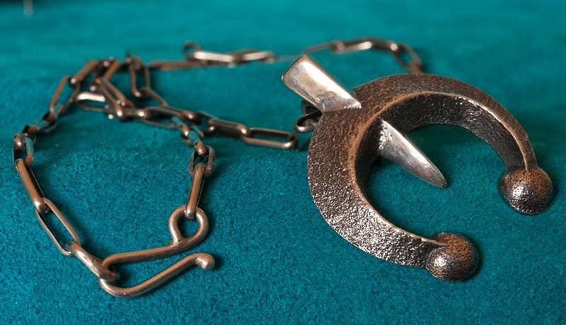 Regular price $525.00 USDSale price $525.00 USD Regular priceUnit price perSale Sold outNaja in Tufa Cast Silver by Matthew White "The inverted crescent form (called Naja by the Navajo) with probable Paleolithic origins has represented the Phoenician goddess...