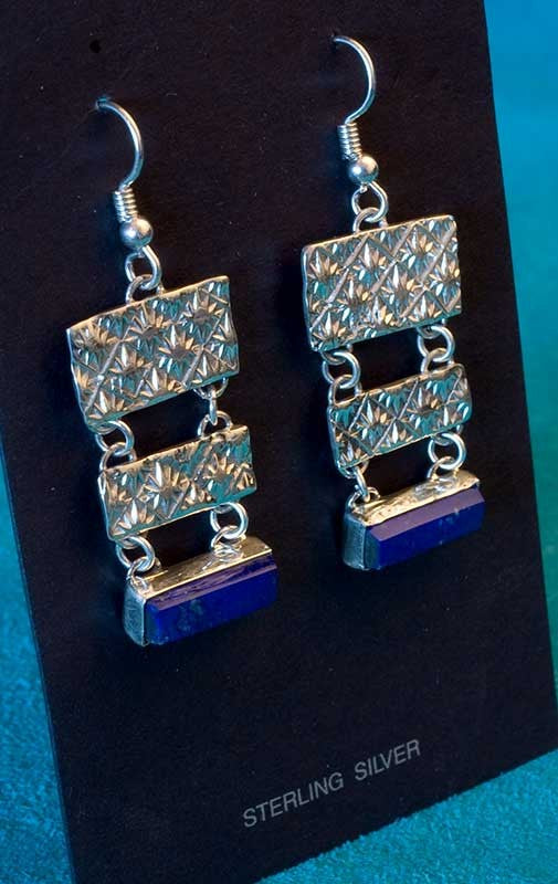 Regular price $575.00 USDSale price $575.00 USD Regular priceUnit price perSale Sold outComplex hand stamped Sam LaFontain native american jewelry Lapis Earrings 3/4" Wide These Sam LaFontain native american jewelry Lapis Earrings measure 2" Long