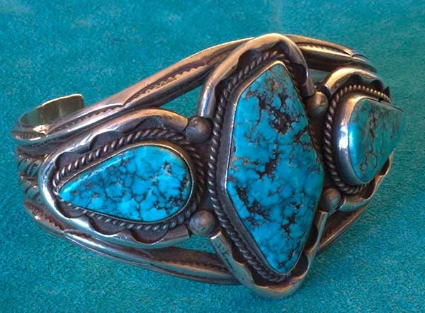 Regular price $2,450.00 USDSale price $2,450.00 USD Regular priceUnit price perSale Sold outBlue Green Vintage Water Web Kingman Gemstone Bracelet Circa 1940's 1950's The silver setting is heavy, hand hammered, silver coin or ingot. The design is early...