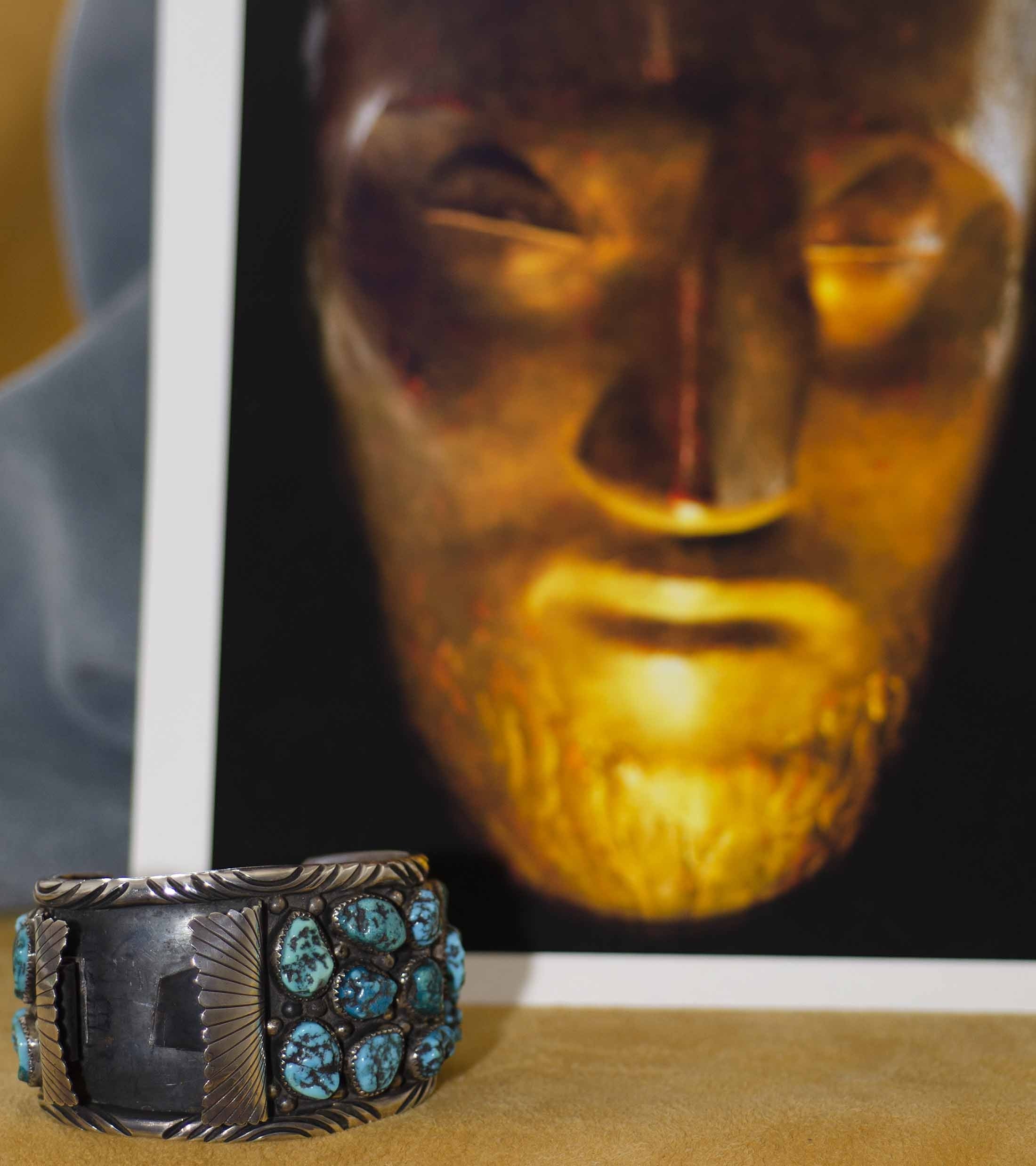 Regular price $1,555.00 USDSale price $1,555.00 USD Regular priceUnit price perSale Sold outKachina face with Snow Cloud and maze design Imagine a beautiful vintage or maybe modern watch mounted on this silver and gem Bisbee Turquoise watch band... stunning...