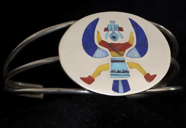 Regular price $375.00 USDSale price $375.00 USD Regular priceUnit price perSale Sold outInlayed Silver Knifewing Bracelet Turquoise, Coral, Lapis, Opal and Shell Inlay supported on 3 silver wires. It is 1 3/16" wide for a 6" wrist. It...