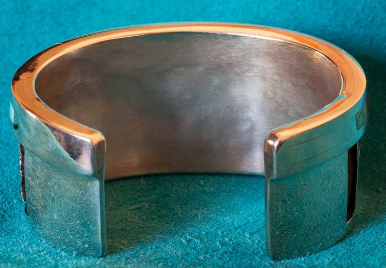 The bracelet was handmade by Albert under the guidance of his father Vernon. It is heavy, solid silver with natural gemstone inlay. The gems are the colors that surround us here in the high country of the Southwest. Turquoise skies, coral red mountains, green pine trees...