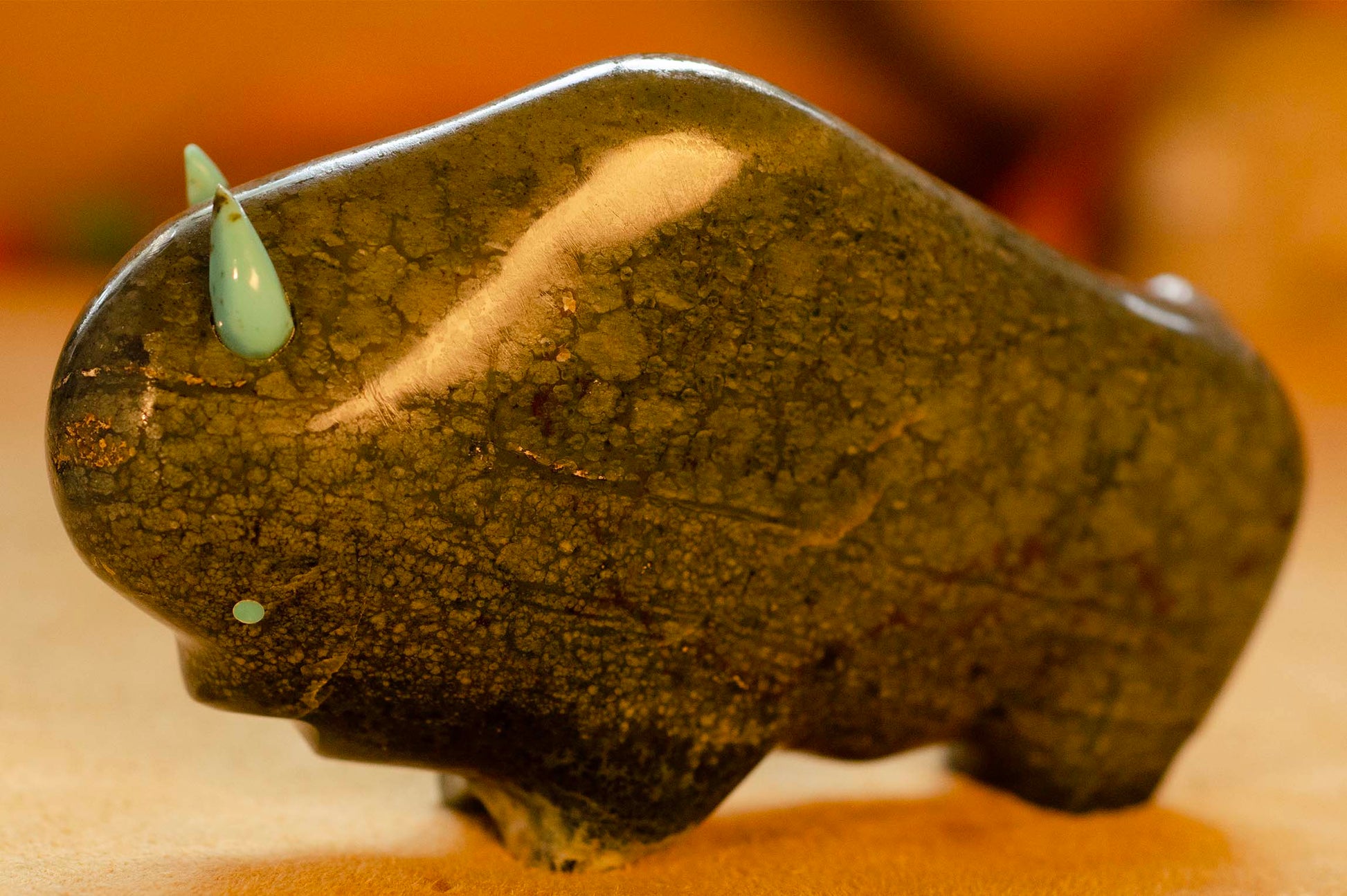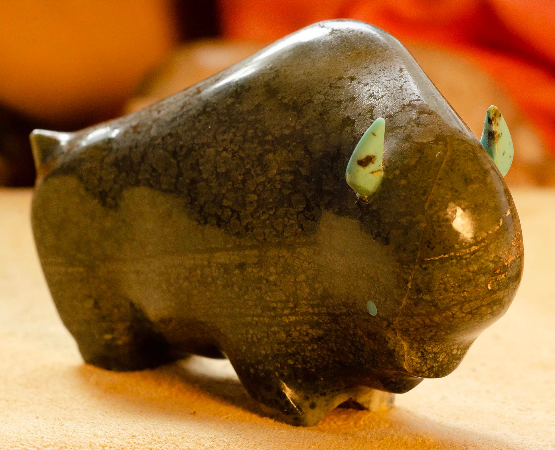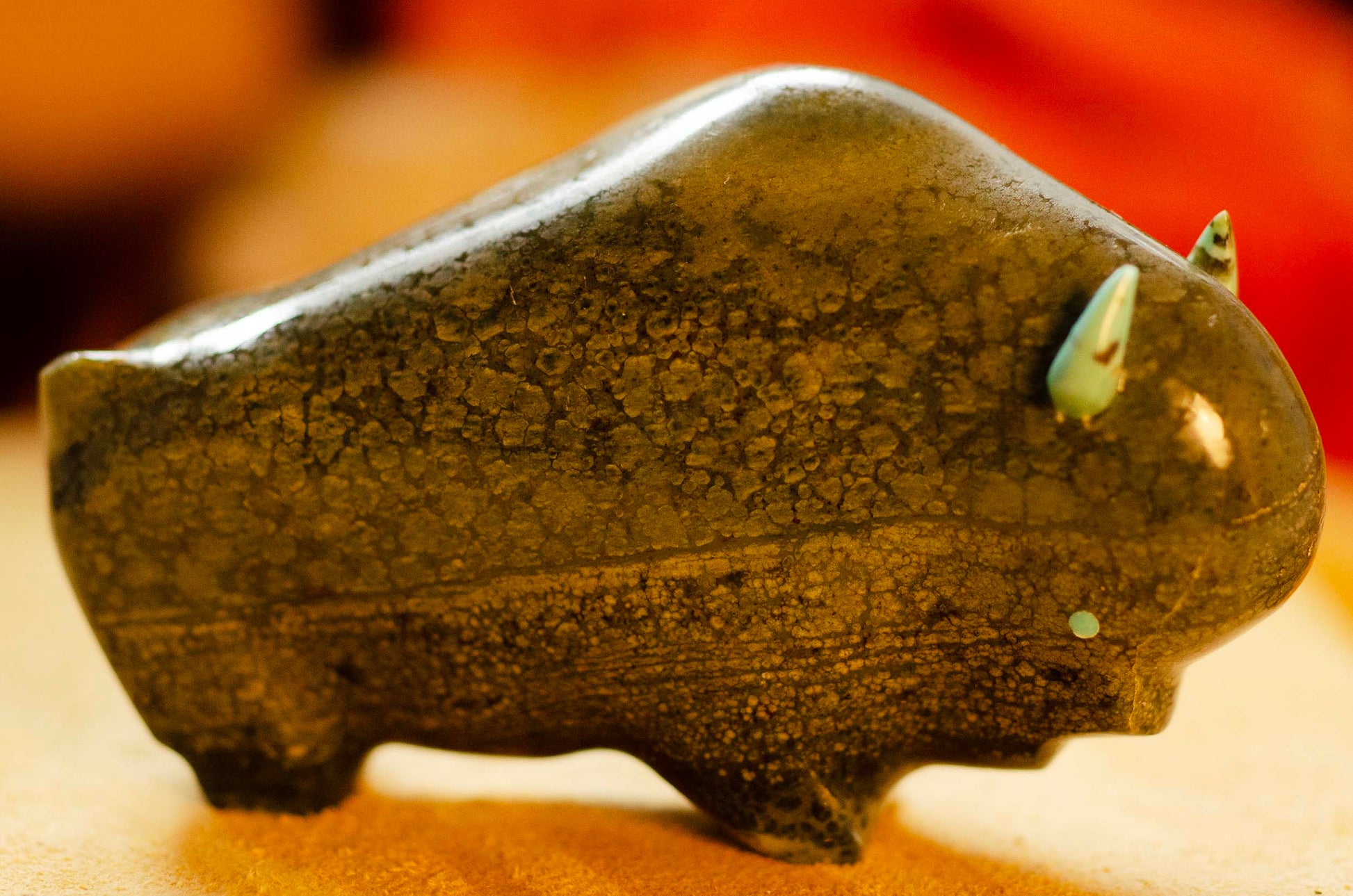 Here is a large Lynn Quam, Serpentine Buffalo. It measures 4 1/2" long x 2 3/4" tall. The eyes and horns are turquoise. You cannot close your hands around the carving... small hands, perhaps use two hands to carry it.