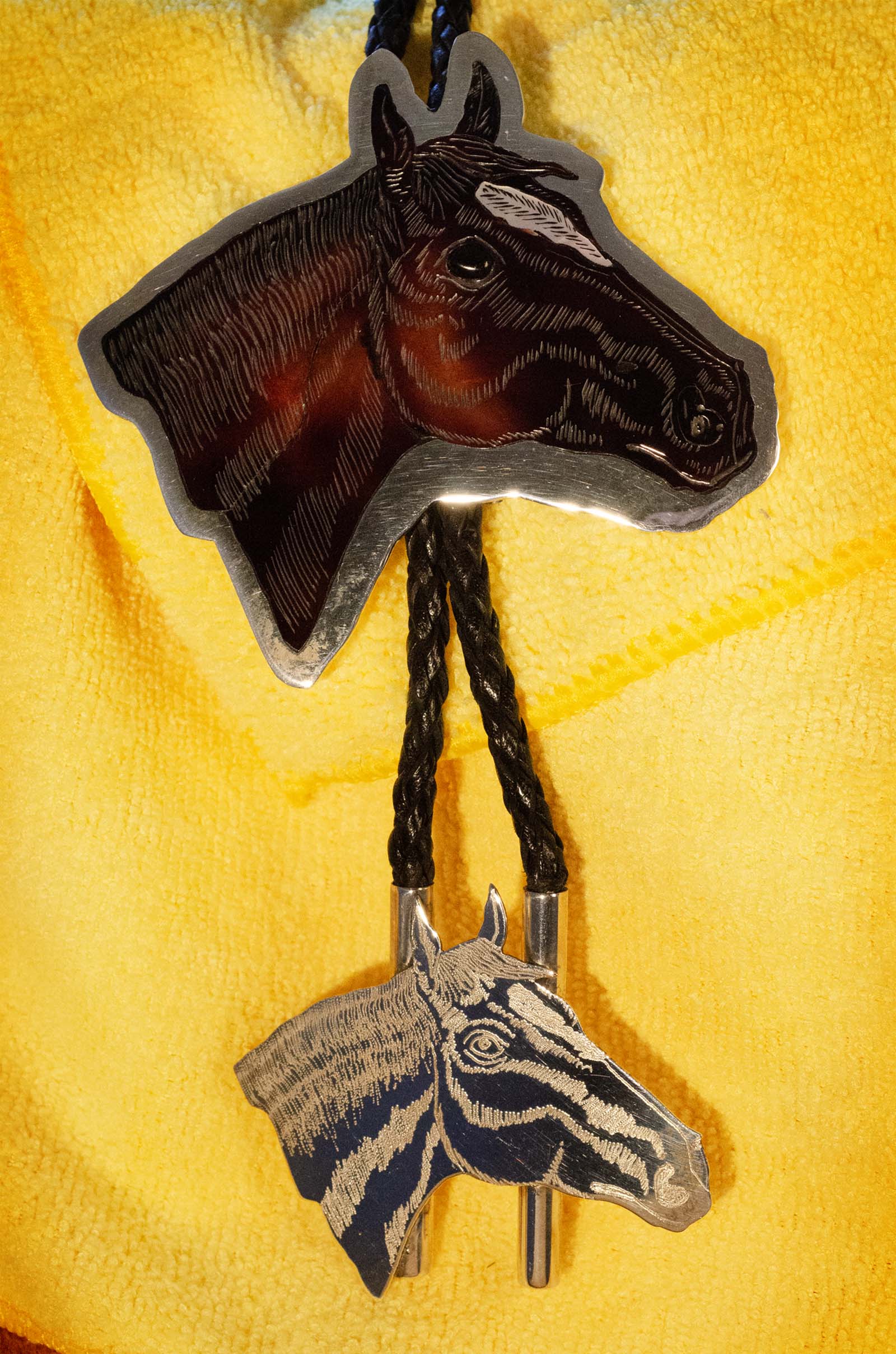 Included is Leather String Tie with a large Engraved Silver Horse Portrait.