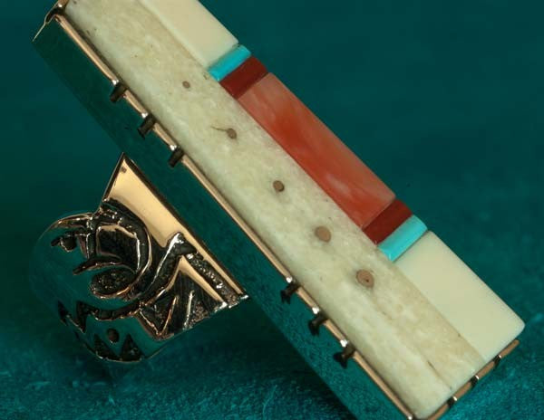 Silver Inlaid with 14K Gold, Turquoise, coral, and fossil ivory