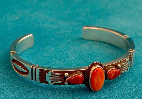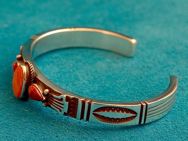 This Norman Byia Native American Silver and Shell Cuff Bracelet B measures 1/4" wide