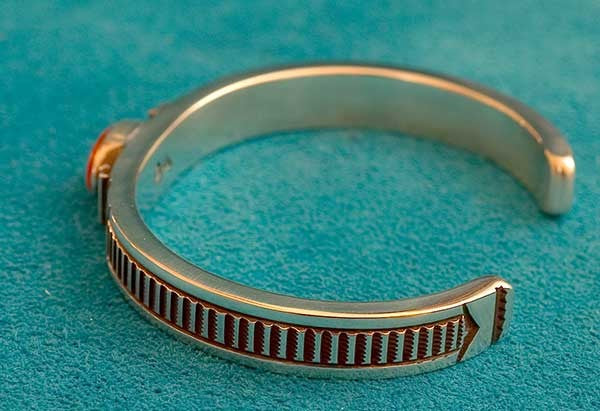 This Norman Byia Native American Silver and Shell Cuff Bracelet is for a 5 1/2" wrist