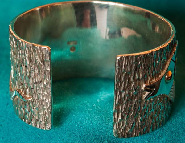 This Kee Yazzie native american jewelry Silver Gold and Coral Bracelet is 1 3/4" wide