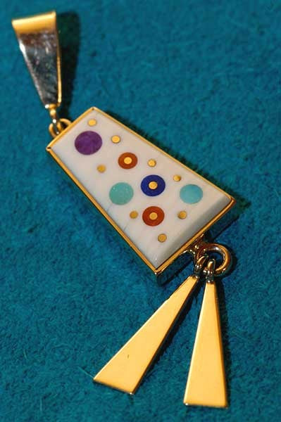 This 14k Gold Pendant is inlaid with Fossil Ivory, Coral, Turquoise,