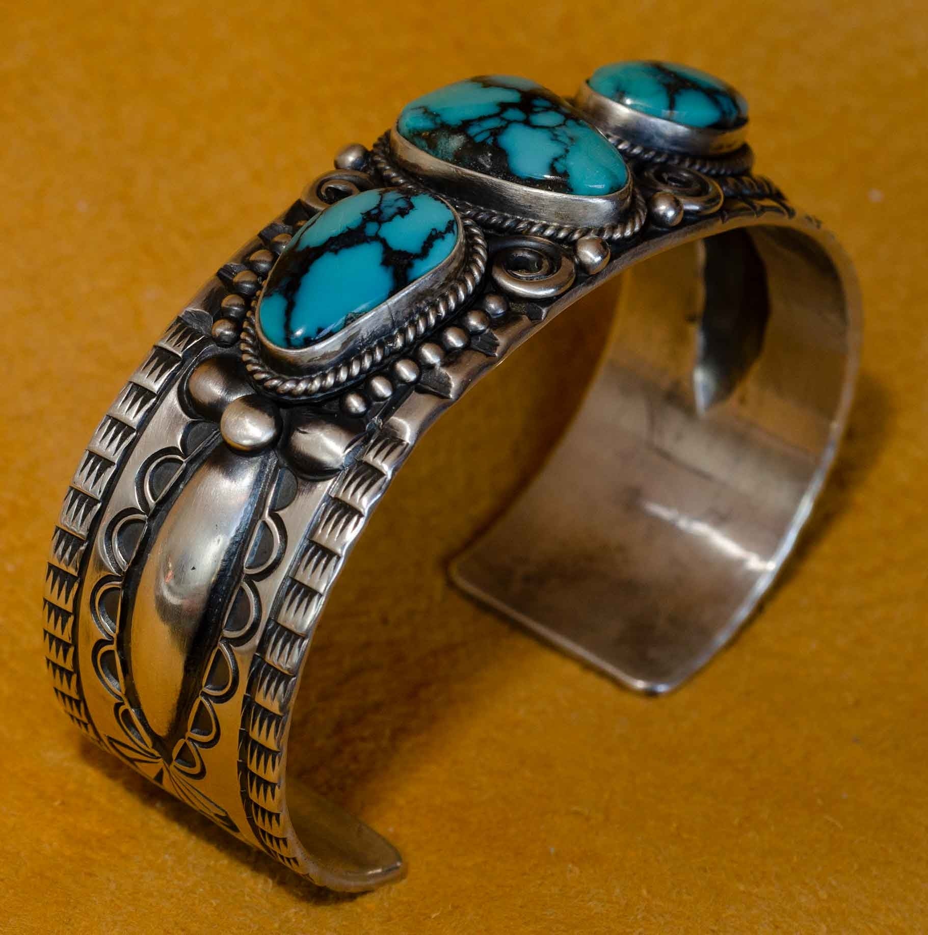 Regular price $1,285.00 USDSale price $1,285.00 USD Regular priceUnit price perSale Sold outDavid Lister (deceased) - Silver and Turquoise Bracelet This is a new bracelet made circa 2000. David Lister was the son of noted Navajo silversmith, Ernie...