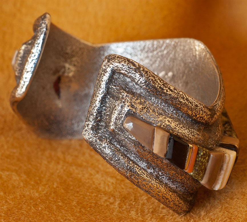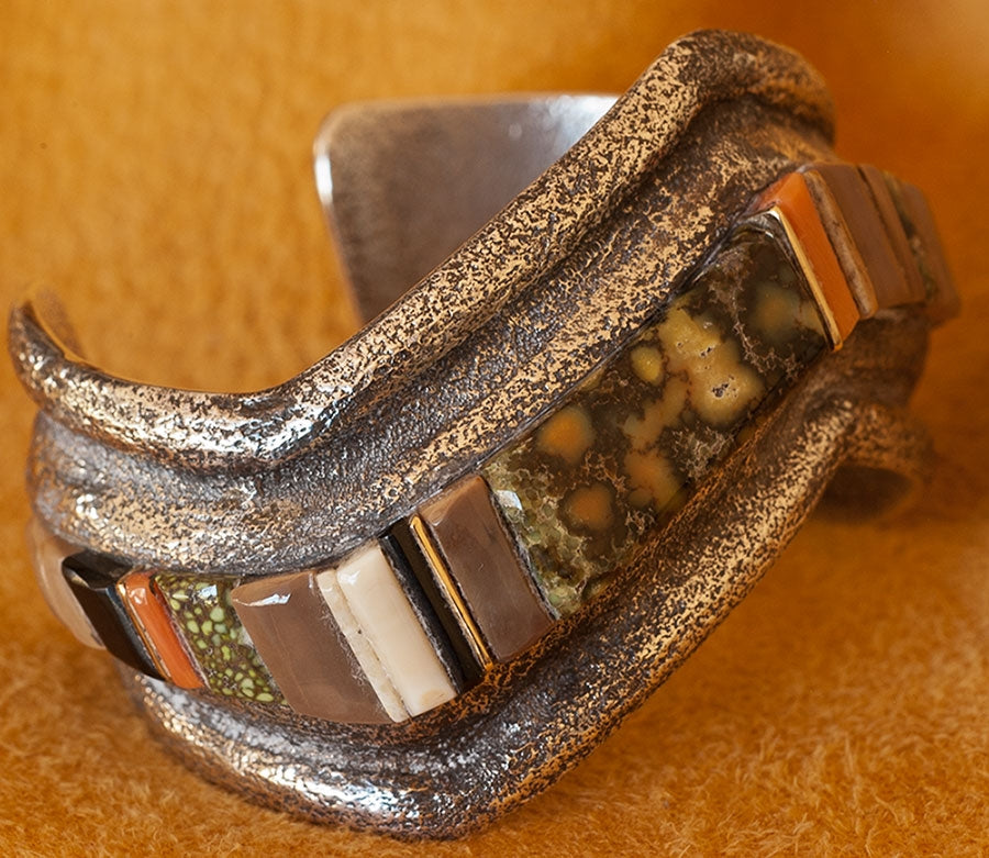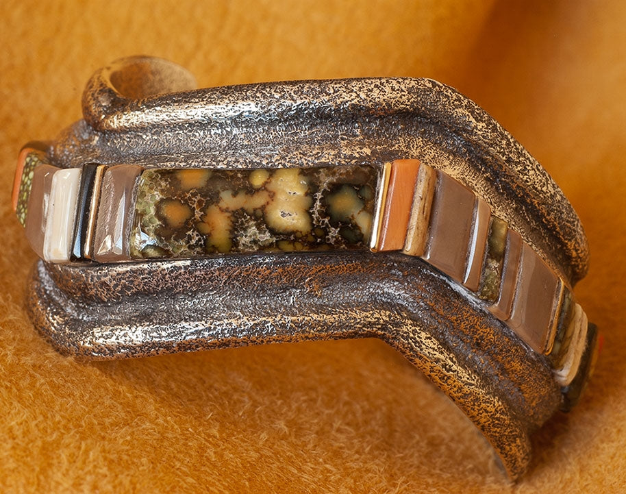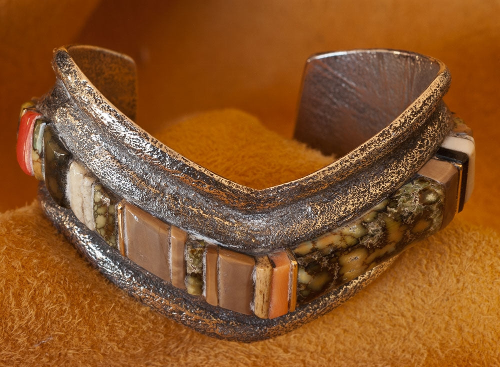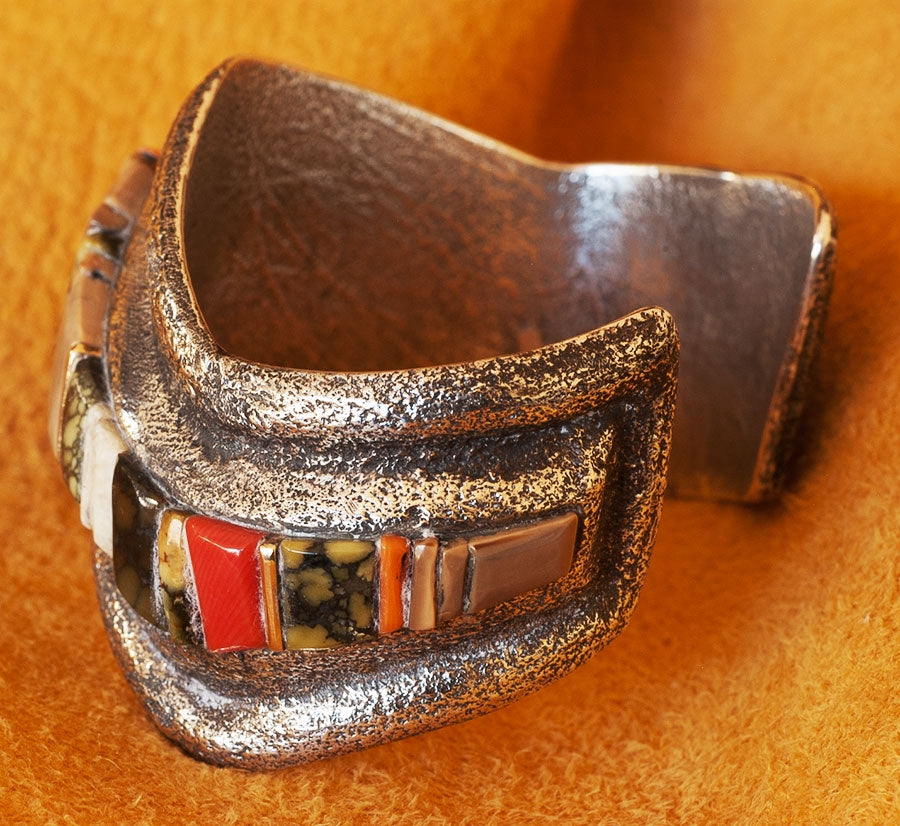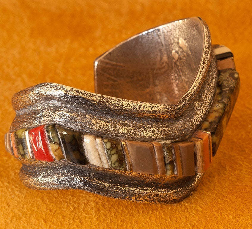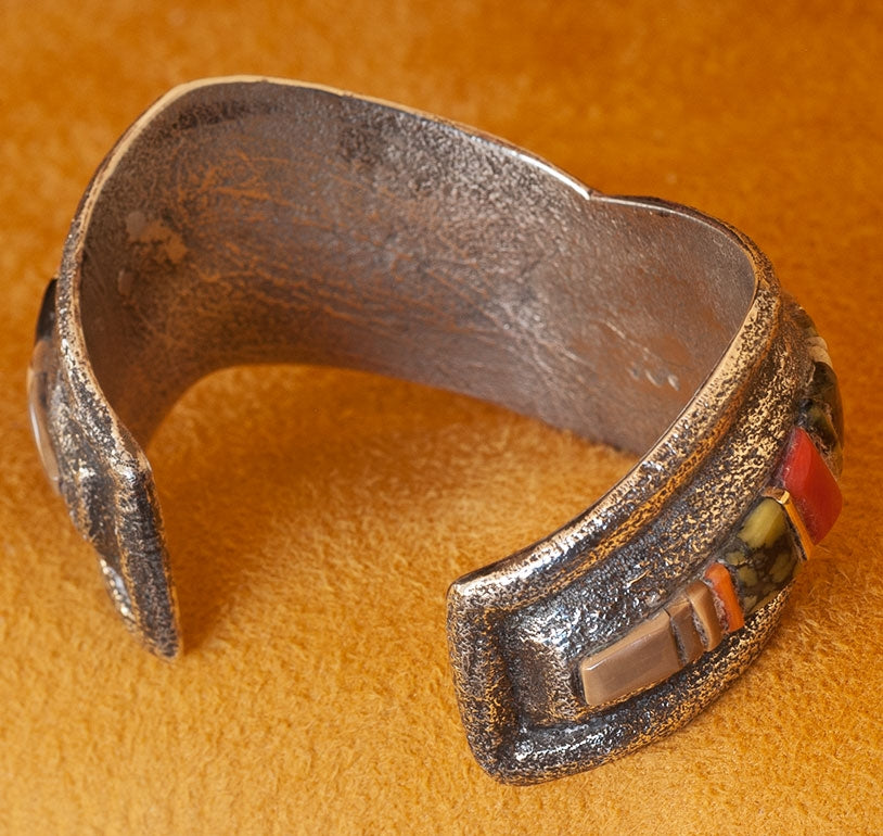 Tufa Cast Silver Bracelet with Charles Loloma style Raised Gemstone Inlay. The gem inlay includes Demali Turquoise, Coral and 14K Gold. They rise well above the silver.